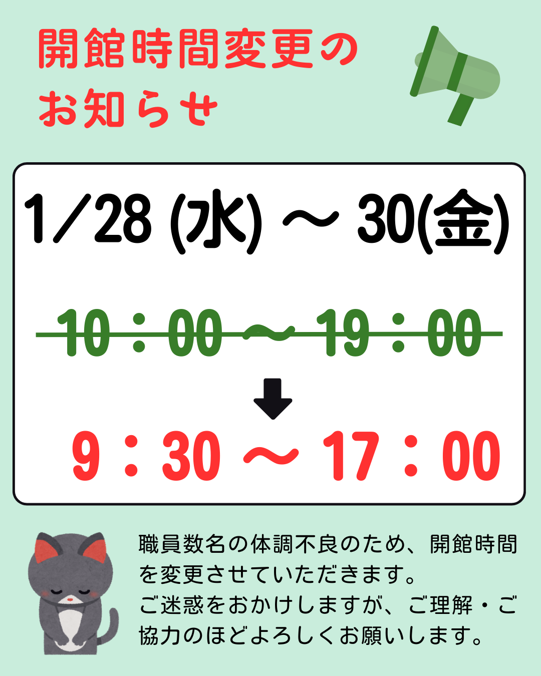 徳之島町立図書館からのお知らせを更新しました(2026年1月27日) 2026/01/27 開館時間変更のお知らせ 1月28日(水)~1月30日(金) 上記の期間、開館時間を変更いたします。 午前9時30分~午後5時までの開館になります。